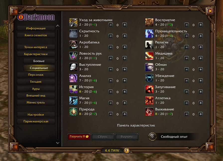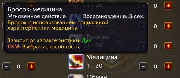 Социальные характеристики также зависят от того, как вы прокачаете боевые характеристики. Например, прокачивая Ловкость, будут повышаться навыки Скрытность и Акробатика, которые напрямую зависят от этого боевого навыка.