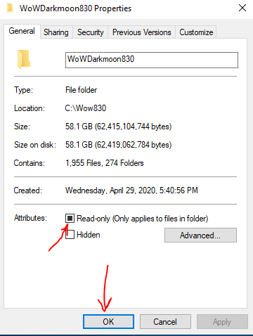 Далее, в новом окне вам необходимо последовать данному порядку: Снять флажок с квадрата только для чтения и нажать OK.