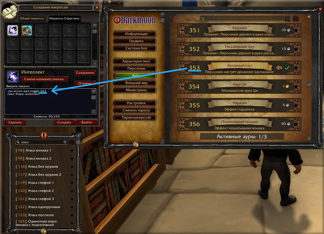 Если же вы хотите анимировать атаку через анимацию, откройте аддон RPSDarkmoon (иконка глаза ярмарки у миникарты), перейдите во вкладку ауры, найдите интересующую ауру. Слева от ее названия будет написан номер ауры, например, 353. По итогу, сделайте, чтобы ваш макрос выглядел следующим образом: