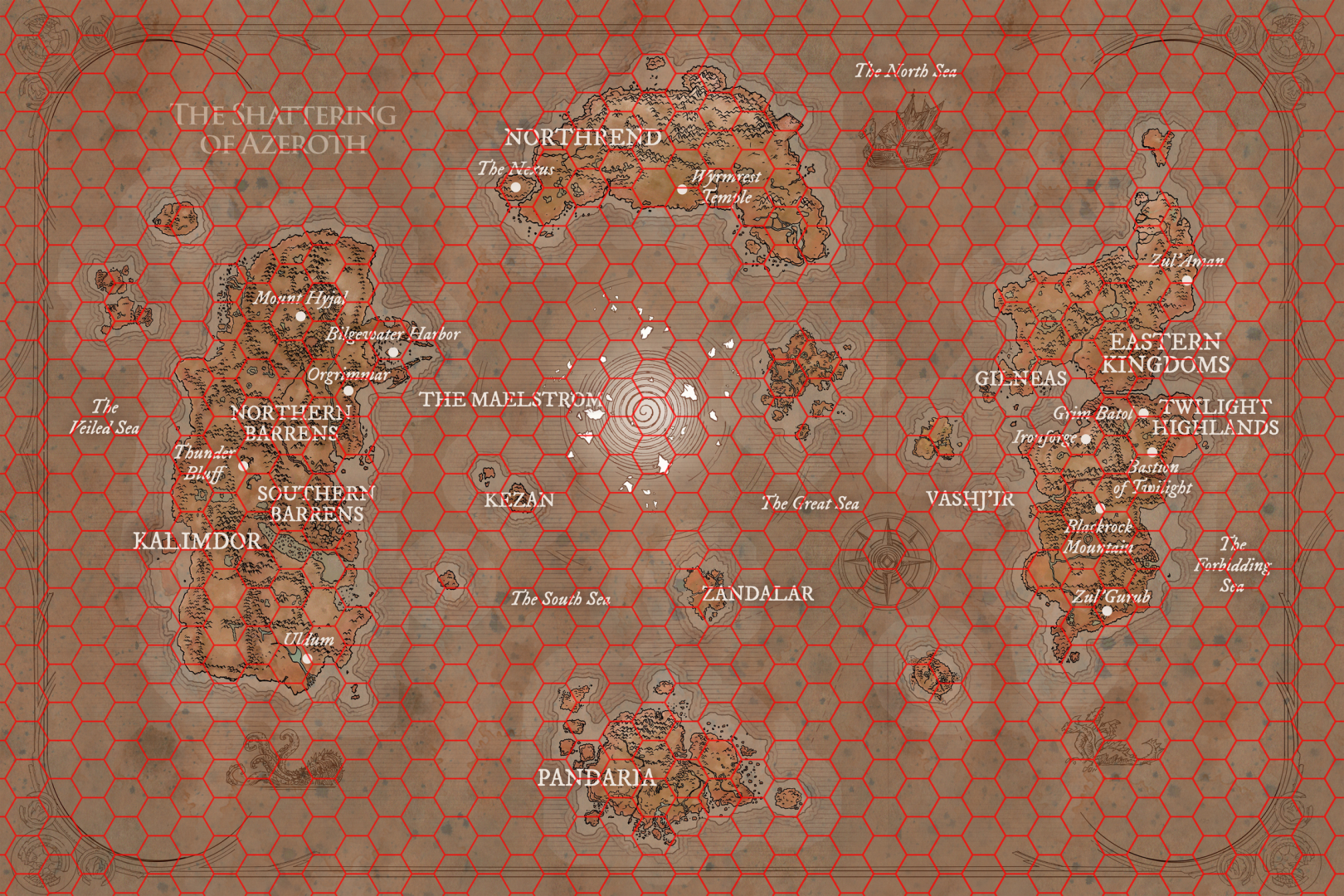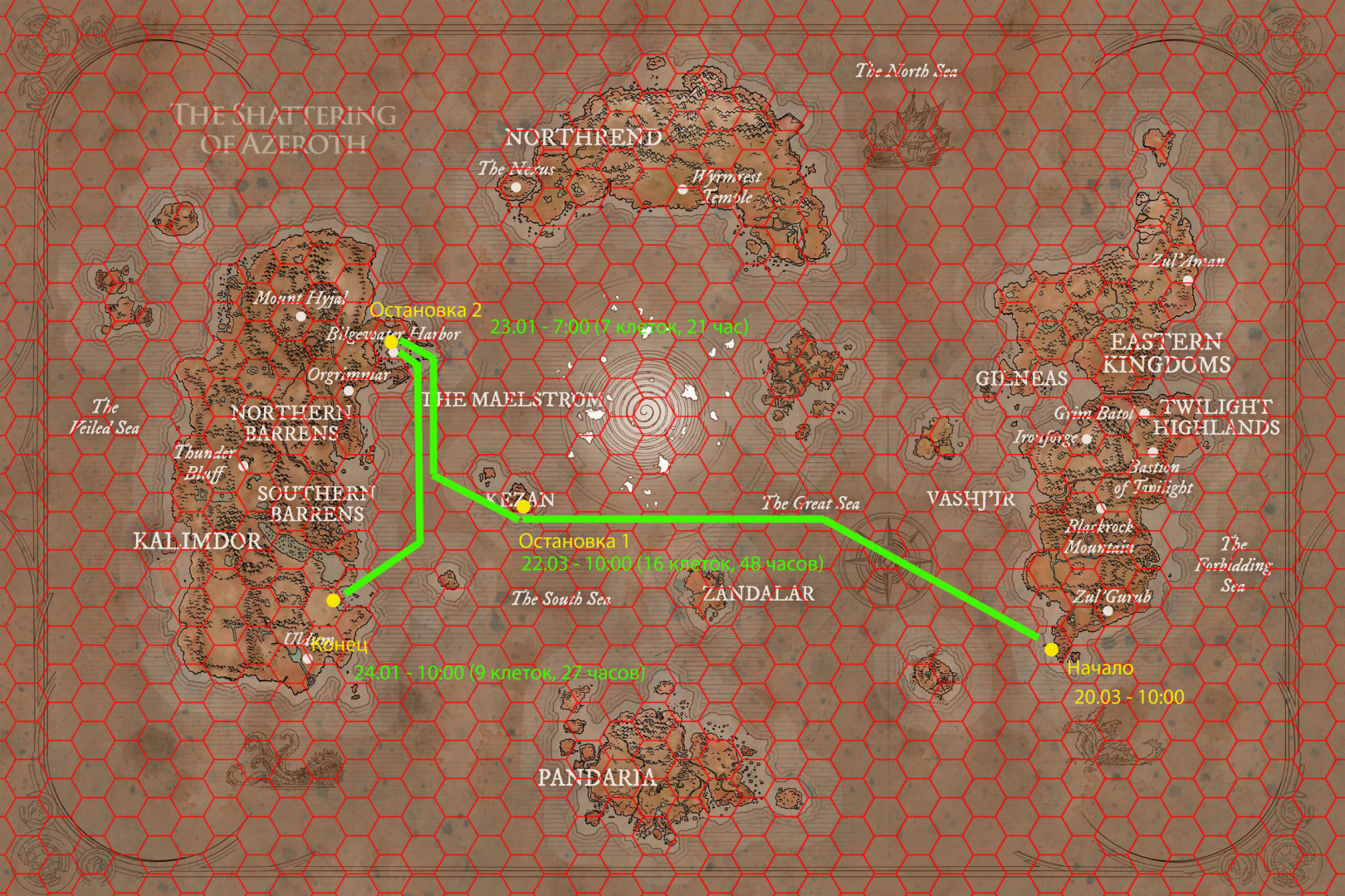 Переход из одной ячейки карты составляет два часа для воздушного судна и три часа для корабля. Если место окончания путешествия либо берег на котором происходит остановка находится на границе клетки либо крайне близко от неё - переход не учитывается. Передвигаться за пределы карты запрещено. Капитаны кораблей и воздушных судов будут отказываться плыть на запад от Калимдора, на восток от Восточных Королевств, на юг от Пандарии и на север от Нордскола.