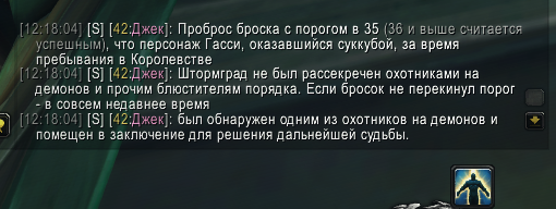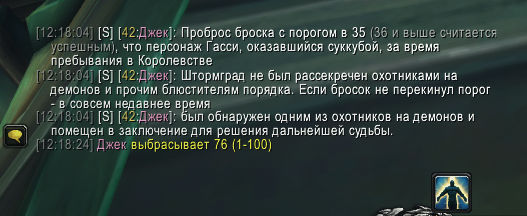 Было решено дать добро на то, что этот персонаж оказался суккубой. Принимая это во внимание, всегда был шанс, что демон мог попасться на глаза охотникам на демонов. Учитывая комплексность ситуации, было решено упрощенно составить шанс, с которым бы персонаж мог попасться на глаза охотникам на демонов. С учетом того, что персонаж в Штормграде появлялся редко, а боевые маги не специализируются на обнаружении демонов, было решено выставить шанс в 35%, на то, что персонаж будет спойман.
