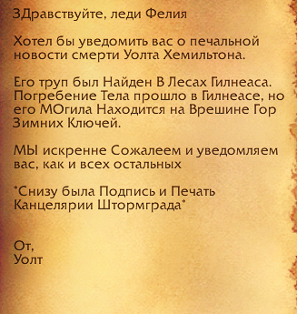 При этом персонаж Уолт совершил отправку писем от имени целой фракции, — Штормграда, — со своей смертью. В письме имеется и печать Штормграда, и подпись Канцелярии Штормграда. Каким образом персонаж Уолт это сделал, если у него нет печатей (подпись мог, право, поставить любую, но печать — определенно нет) на совершение этих действий. Такая рассылка ввела в заблуждение участников ролевой игры:
