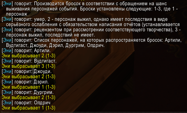 II. В целях объективного решения возникшей конфронтации, а равно с целью ликвидации последствий необоснованно завышенных бросков и порогов преодоления, умершим персонажам было позволено испытать шанс успеха на выживание, где был производен бросок в соответствии с обращением. Броски установлены следующие: 1-3, где 1 — персонаж умер, 2 — персонаж выжил, однако имеет последствия в виде серьёзного ослабления с обязательством написания отчётов (устанавливается рецензентом при рассмотрении соответствующего творчества), 3 — персонаж выжил, последствий не имеет. Таким образом бросок был произведён главой отдела рецензентов AnyTweetAny, где значения распределились следующим образом: Артили — 2, Вудтигаст — 3, Джоуди — 2, Дэрил — 1, Дургрим — 2, Олдрич — 1.