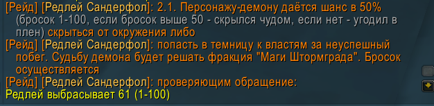 2.1. Персонажу-демону даётся шанс в 50% (бросок 1-100, если бросок выше 50 — скрылся чудом, если нет — угодил в плен) скрыться от окружения либо попасть в темницу к властям за неуспешный побег. Судьбу демона будет решать фракция «Маги Штормграда». Бросок осуществляется проверяющим обращение: