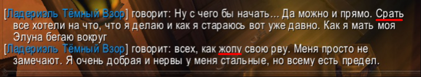 Ночные эльфы — сами по себе представители народа долгожителей с углубленной своей верой, что является для них неоспоримой. Само по себе упоминание божества народа, которым является и ваш персонаж — является богохульным по своей манере, и, как следствие, возникает вопрос — почему ваш персонаж высказался так грубо по отношению к собственной богине?