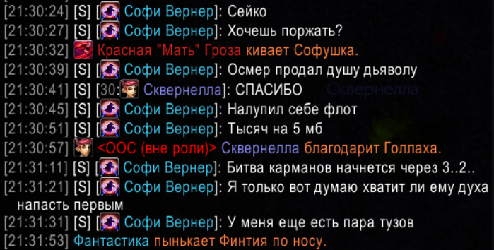 Но помимо этого было замечено нарушение пункта правил 6.20 со стороны таких персонажей, как «Софушка», «Гизмозках» и «Джамбот», которые же получат наказания. Персонаж «Софушка» потеряет 50.000 опыта, как инициатор всего происходящего, а персонажи «Гизмозках» и «Джамбот» по 25.000 опыта на своих основных персонажей.