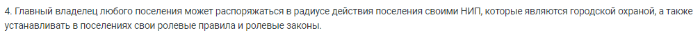Этот пункт говорит нам о том, что главный владелец поселения может в его радиусе распоряжаться своими НИП, что являются его охраной и устанавливать ролевые правила и ролевые законы. Этот пункт ни в коем случае не может добавлять новые, обходить, дополнять правила, что указаны в основных и дополнительных топиках экономики.