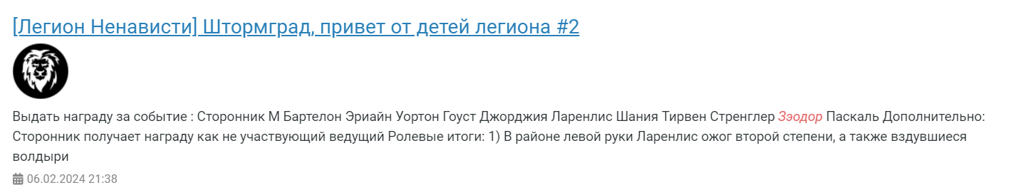 3. Поговорим о персонаже «Зэодор». Вы верно подметили, что он участвовал в событиях с гильдией ТпАШ, ещё был также замечен и в отыгрыше с ВСШ, однако, изучив предысторию персонажа, мы пришли к выводу, что данная претензия также подлежит отказу в удовлетворении. Причиной данному решению послужило то, что данный персонаж изначально является преступником и состоял в преступной организации «Чёрный Список», после которой отыгрывался как антагонист и в гильдии «Легион Ненависти». Ничего не мешает преступнику в прошлом скрываться среди солдат, учитывая и то, что его персонаж не был пойман, обнаружен, а также не находился в розыске в Альянсе. Сейчас, как мы можем наблюдать, персонаж вновь вернулся к пути криминала. Данный момент следует решать непосредственно в ролевой игре, не нарушая пункт правил 6.20. Действия самого игрока будут изучены более детально в рамках работы отдела модерации.
