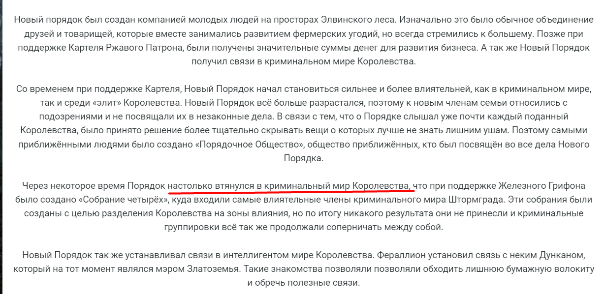 1. Претензии по гильдии «Новый Порядок». Действующий концепт гильдии, по сути, не совсем противоречит захватам, т.к. сама гильдия — криминальная, что отражено в их действующем топике. Однако претензия касаемо того, что они действуют не в Штормграде, уже была озвучена главе гильдии и нами уже выдвинуто ему решение о переделывании топика по согласованию с рецензентами. Глава гильдии уведомил, что работа идет активно и вскоре данное несоответствие будет устранено так, чтобы объяснить в целом, почему Новый Порядок покинули Штормград и решили найти себе новое место. Касаемо этого момента беседа с членом поддержки Hainz была проведена мастерским составом отдела поддержки и находится на контроле.