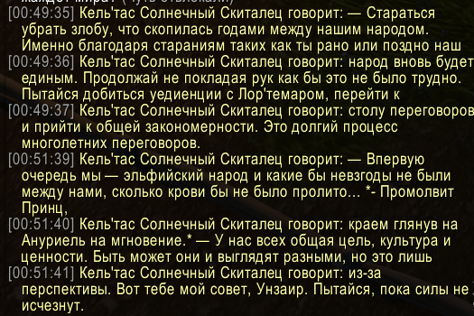 — Отыгрыш со стороны самого Кель'таса также вызывает вопросы: надменный и гордый принц, предавший некогда свой народ во имя своих личных целей, оказывается вдруг крайне снисходительным и ведёт рассуждения на тему «объединения эльфийских народов», что с его выглядит достаточно странно.