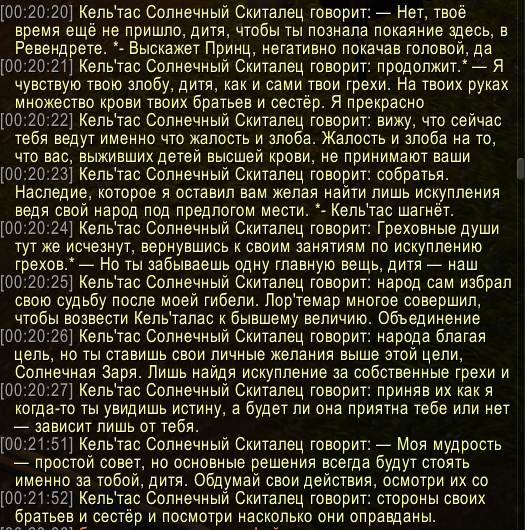 — Прежде всего Кель'тас, будучи персоной достаточно высокомерной, о чём нам неоднократно говорится в течении сюжетной цепочки искупления его грехов, без какой-либо внятной причины принимает двух незнакомых ему высших эльфов, которые даже не участвовали в его собственном освобождении. Неясно почему без какой-либо причины тот принимает двух незнакомцев и тратит на них своё время. Мы не можем знать насколько тот хорошо продвинулся в искуплении своего греза за прошедшие годы, ко всему прочему — понятия времени в Тёмных Землях и вовсе нет, хотя как явление присутствует в искаженном виде.
