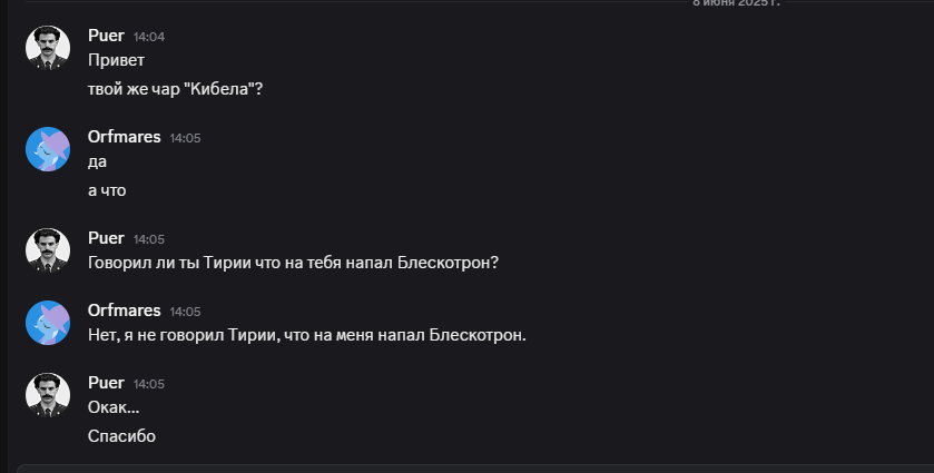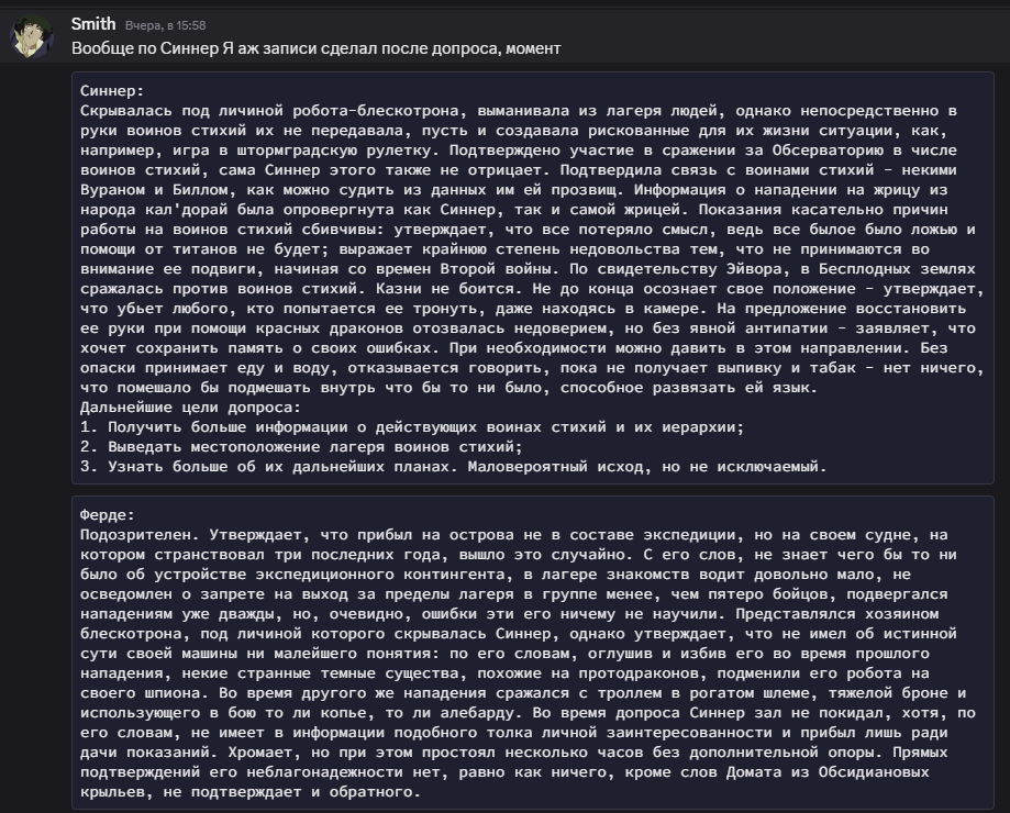 Но при этом игрок Тирия исказил факт того, что ему сказали и передал это игроку Синнер, именно тогда, когда у персонажа Синнер возникли вопросы о том, как же герои узнали о том, что под обликом скрывается именно кто — то.
