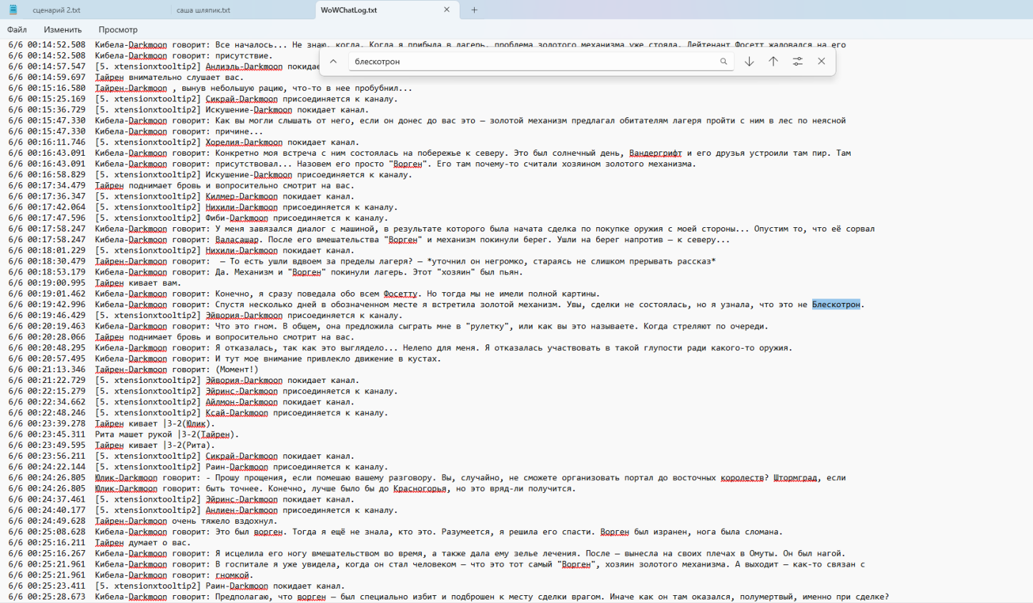 6/5 23:24:01.869 |Hchannel:RAID|h[Лидер рейда]|h Тирия-Darkmoon: Строка 781666: 6/5 02:29:41.233 Кибела-Darkmoon говорит: Мне довелось инициировать заключение сделки с Блескотроном — как вы можете знать, они дарят