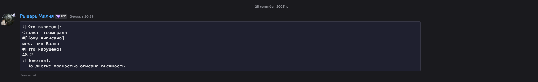 Если у Вас остались вопросы касаемо вынесенного решения, то Вы можете обратиться ко мне в личные сообщения на сайте (https://rp-wow.ru/users/4802) или в Discord (.dlev) для получения ответов на них. Приятной игры!